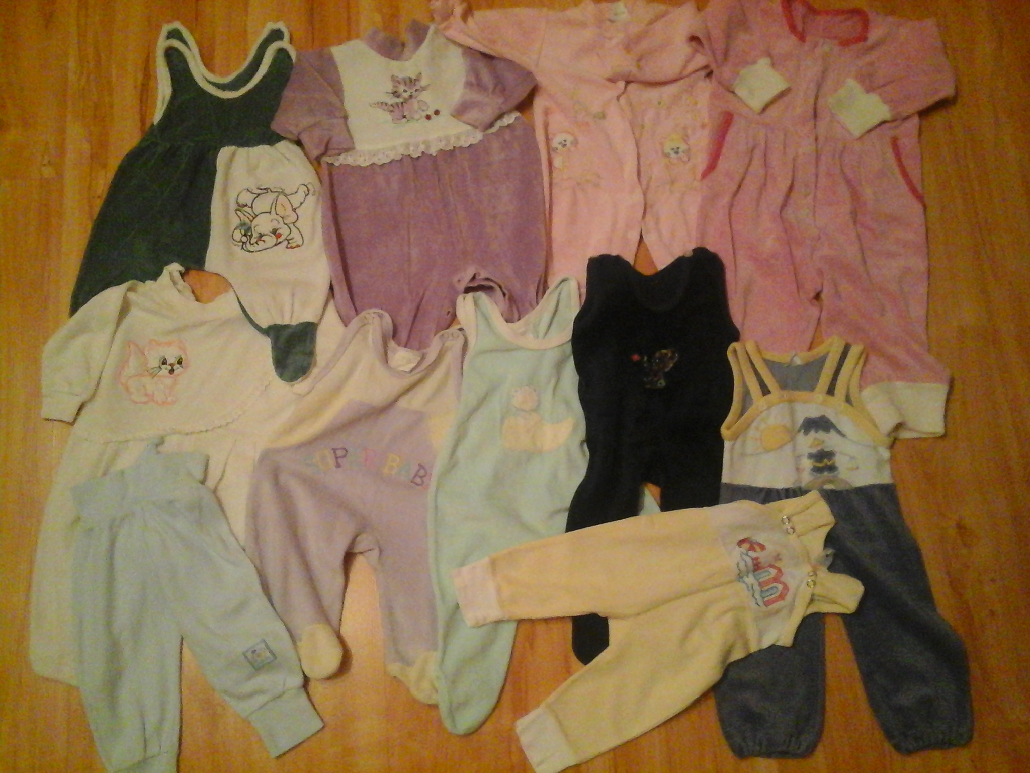 Dupačky zelené-slon, samet, zn. JIKO, vel. 58, overal fialový-kočička, samet, zn. Queen, vel. 58, overal růžový-kočičky, samet, zn. HOPTINY, vel. 62, overal růžový, samet, zn. LOANA, vel. 74, overal bílý-kočička, samet, zn. ?, vel. 56, dupačky fialové, samet, zn.?, vel. 56, dupačky zelené-kočička, samet, zn.?, vel. 62/68, dupačky modré-medvídek samet, zn. ?, vel. 50/56, dupačky fialové-Japonec, samet, zn. Micky, vel. 62, dupačky žluté - koupaliště, bavlna, zn. Milano RIB, vel. 50/56, tepláky modré, bavlna, zn. flexi, vel.62.