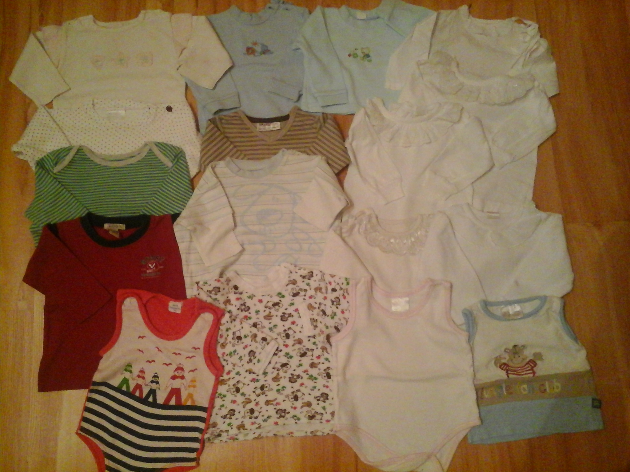 Triko bílé-volánky, bavlna, zn. Ducky, vel. 68, triko modré-pejsek, bavlna, zn.?, vel. 62, triko zelené-medvídek, bavlna, zn. ?, vel. 56, triko bílé-puntíky, bavlna, zn.?, vel. 62/68, triko zelené-proužky, bavlna, zn. F&F, vel. 3-6m., triko béžové-proužky, bavlna, zn. OKAY, vel. 62, triko bílé-proužky+pejsek, bavlna, zn. CHEROKEE, vel. 68, triko červené, bavlna zn. H&M, vel. 4-6m., triko bílé-Afrika, froté, zn. KIWA, vel. 82, košilka bílá s volánkem, plátýnko, zn. ?, vel.6-3m., triko bílé s volánkem, bavlna, zn. WEISER, vel. 62, body bílé s volánkem, bavlna, zn.?, vel. 56-62, triko bílé s volánkem, bavlna, zn. Vejnar, vel. 62/68, triko bílé dl. rukáv s volánkem, samet, zn. Gelati, vel. 62/68, triko barevné s hrochem, bavlna, zn. obrázek medvídka, vel. 56, body-tílko červené- námořníci, bavlna. zn.? vel. 74.