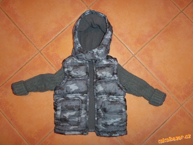 Vesta a kapucka šusťák, podšitý fleecem, rukávy pletené podšité saténem, pro pohodlné oblékání.