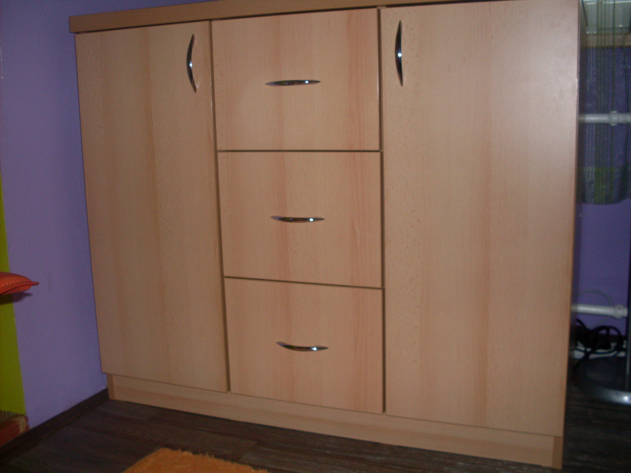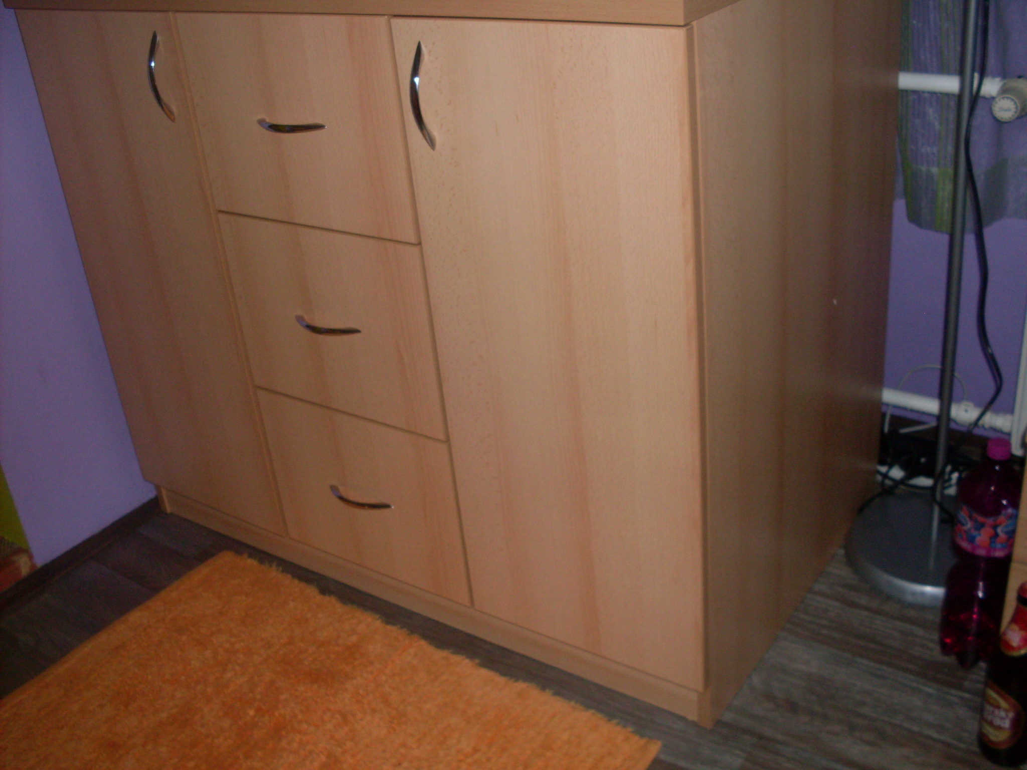 Text inzerátu: dětská komoda,masivní,pevná,dělaná na zakázku,opravdu kvalitní,velice prostorná-do větší místnosti ideální-výška 110,výška 95,šířka 65(cm).velmi dobrý stavv prostřed 3prostorné šuplíky,po stranách dvířka každé po 3poličkách. zde produkt popište