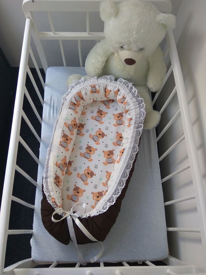Hnízdečko je oboustranné, je vyrobeno ze 100% bavlny, mantinely jsou plněny molitanovou drtí, matrace je z 3 cm molitanu. Rozměry hnízdečka jsou cca 85x55 cm.