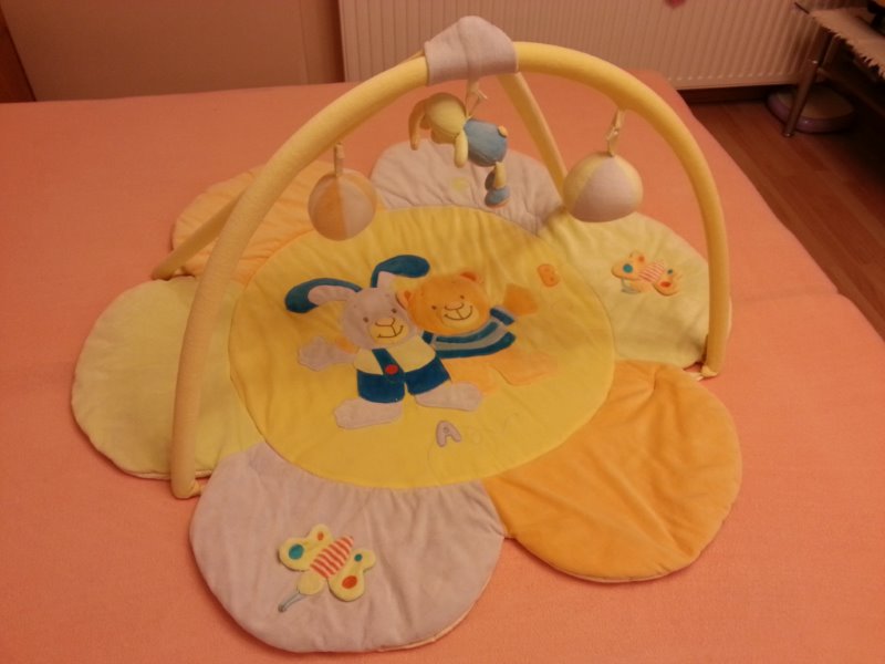 dece zabudovaná různá pískátka, šustivé zvuky, apod., okvětní lístky jsou vypolstrované (jako polštářky), na obručích je pískací zajíček, kulička s rolničkou a zrcátko v kuličce, tyto díly jsou na suchý zip. Známky běžného používání z nekuřáckého prostředí po dvou dětech. V ceně je i originál igelitový obal s uchem. Nalomená jedna obruč hrazdičky. Jinak v dobrém stavu.