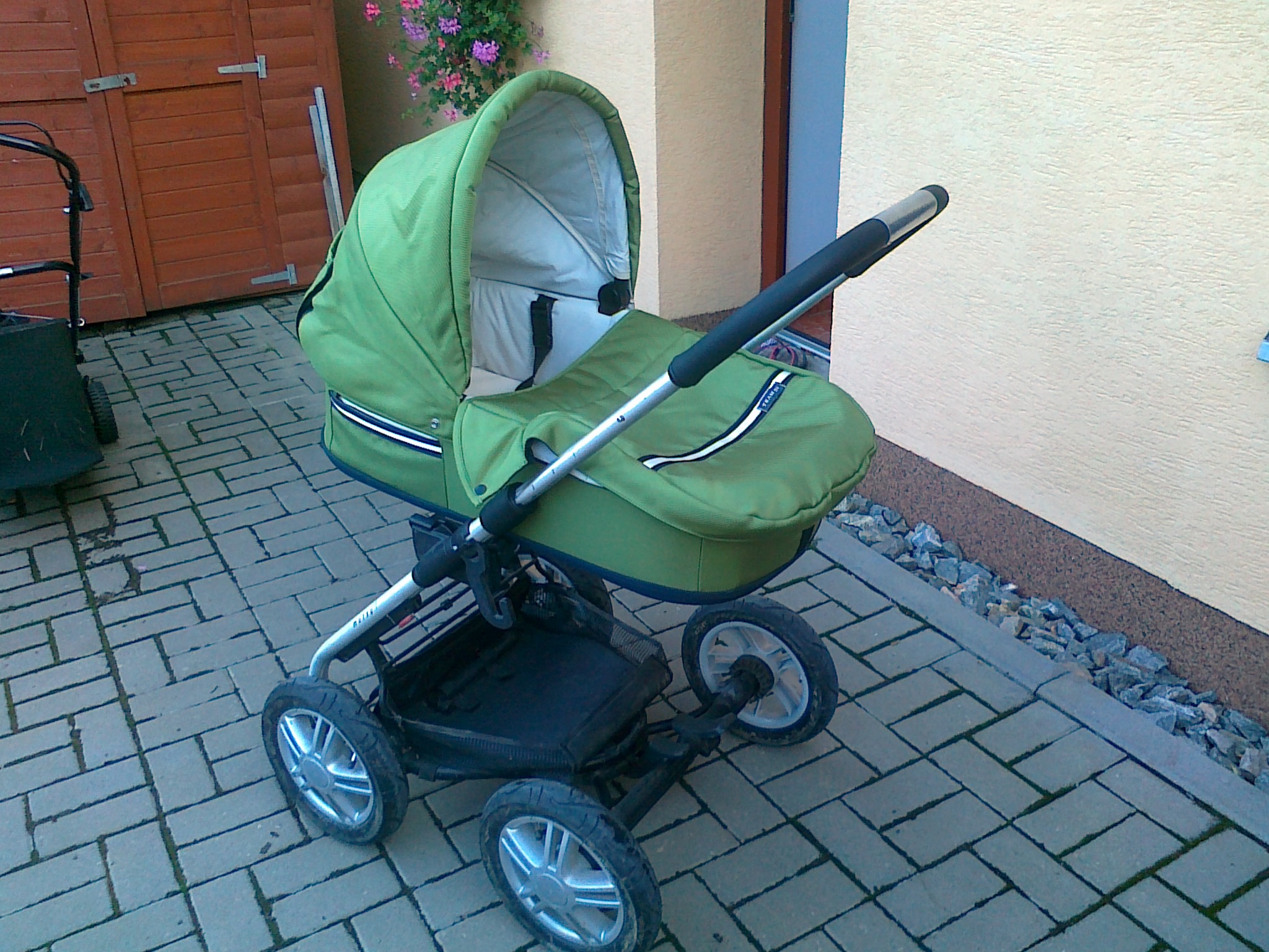 Text inzerátu: Prodám zelený kočárek značky mutsy, má všechna čtyři čtyři velká, nafukovací, zadní kola jsou otáčecí (lze zablokovat). Nabízím jako dvojkombinaci - korba a sporták. v ceně háčky na nákupní košík + košík.