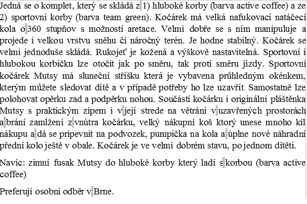 Text inzerátu: Dnes po 1 diteti, velmi zachovaly stav v krasne hrasko vezelene a hnede barve + original doplňky – 5 500,-Kč. Preferuji osobní odběr v Brne, ale po domluvě i poštou dle tarifu české pošty. Lze zakoupit jen jednotlivé části: podvozek 3.000,-, korba 1.500,-, sport.nástavba 2.000,- . Při koupe vsetkych casti zvýhodněna cena za komplet - 5 500,-Kč.