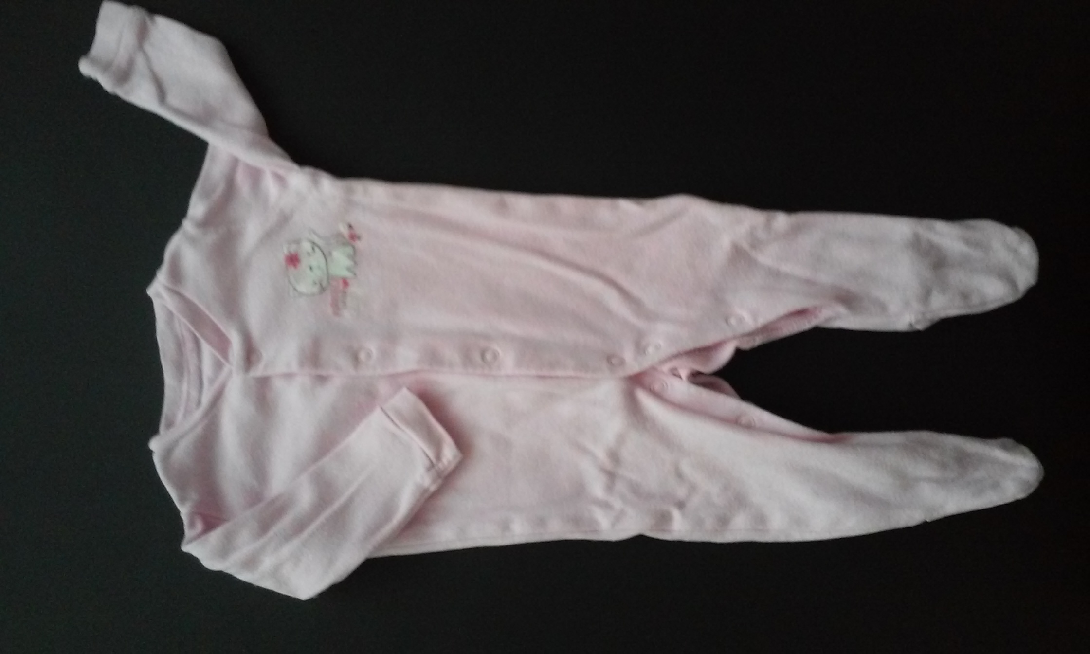Velmi zachovalý (lehká žmolka od praní) overal s dlouhým rukávem a obrázkem kočičky. Vhodný pro děti ve věku do 1 měsíce.