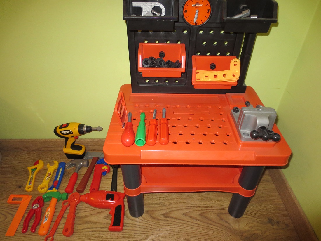 Prodám dětskou dílničku včetně příslušenství ( svěrák, nářadí: aku vrtačka, vrtačka, klíče, kladiva, šroubováky, nůž, kleště, šrouby, matky atd.