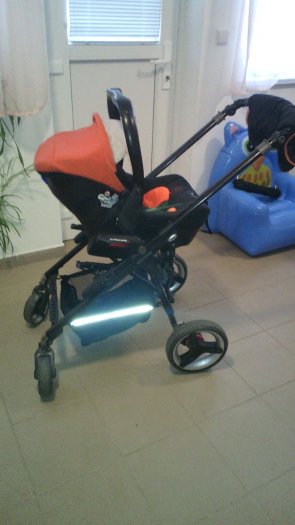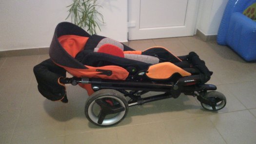 Sporťák má tři polohy - skoro úplný leh, polosed, kolmou. Lze ho otáčet čelem k vám a nebo do prostoru. V poloze do prostoru je lze složit i s konstrukcí. Jinak pouze samostatně. Rukojeť pro vás je také polohovatelná stejně jako plocha na nožičky pro mrně. Rukávník je v barvách kočárku - super věc na zimu, krásně zahřeje.