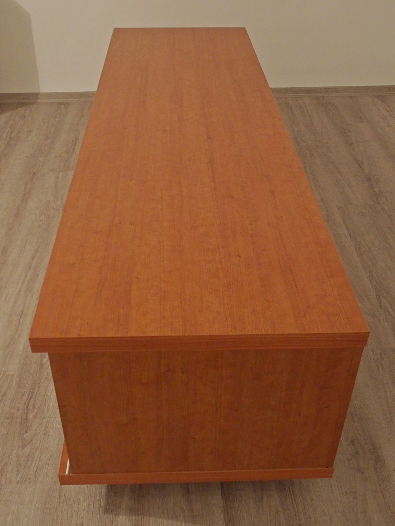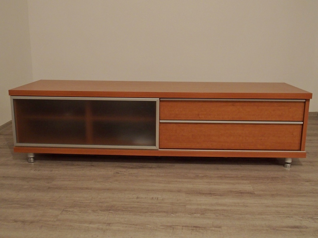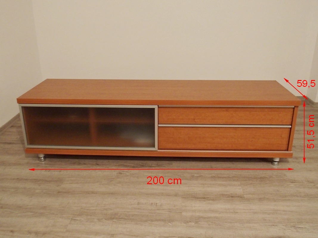 TV stolek Red Apple, R098-80, rozměr Š 200 x V 51,5 x H 59,5 cm, lesklá dýha, barva třešeň, v zadní stěně otvory pro kabeláž, vhodné pro AV techniku, 2x dělené zásuvky, 1x posuvná dvířka, matné sklo, rámeček z bílého kovu, výškově stavitelné kovové nohy. Nepoškozená, PC 10999, prodej z důvodu rekonstrukce bytu. Cena 3600 Kč.