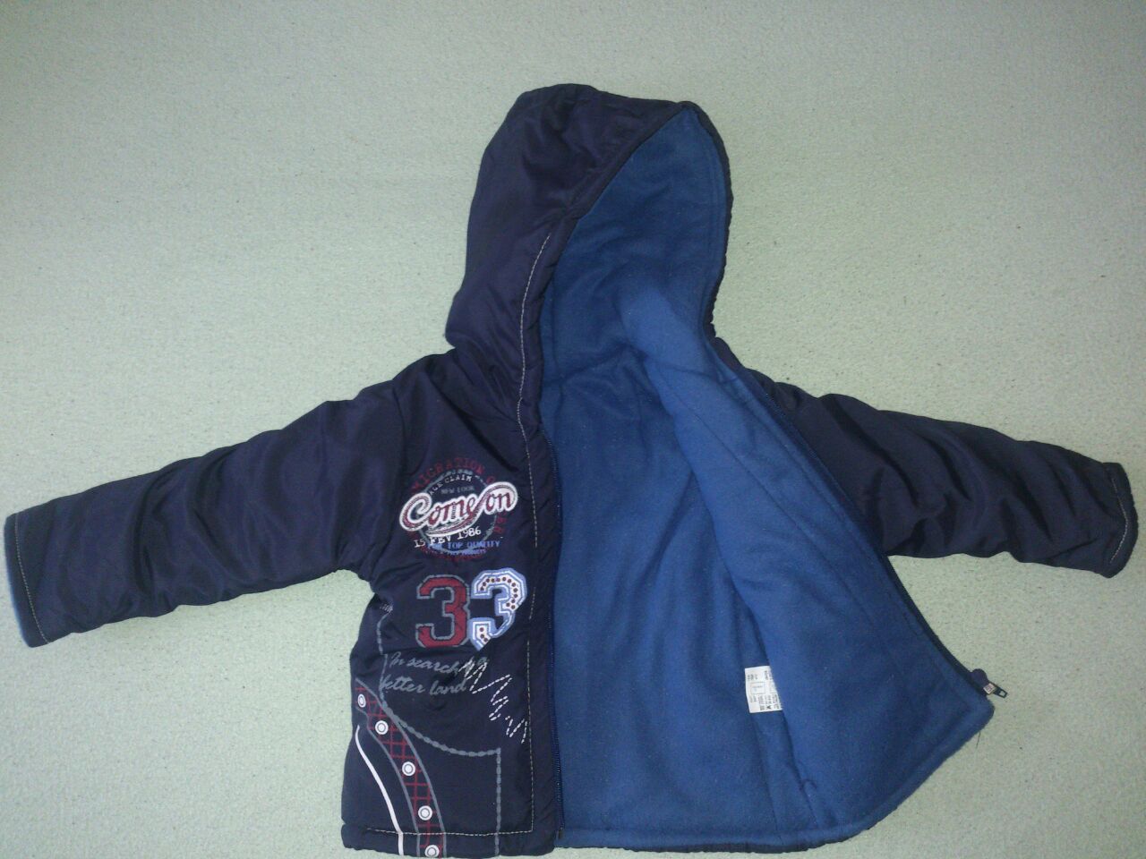 Stav produktu: Nový produkt Text inzerátu: Teplá bundička barva – modrá na přední straně obrázky bundička je na zip, zateplená i se zateplenou kapucí velikosti -1 rok,2roky,3roky mohu přeměřit