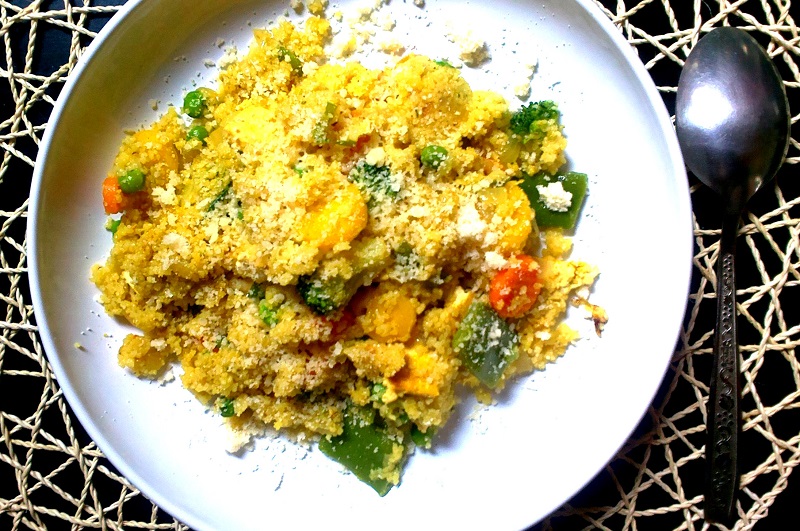 Kuskus nasypeme do misky a vidličkou pečlivě promícháme s dvěma lžícemi olivového oleje, tak aby bylo obalené každé zrníčko. Poté ho zalijeme vývarem, promícháme a necháme nabobtnat. Mezitím si na jemno nakrájíme cibuli a necháme ji zesklovatět na pánvi na jedné lžíci oleje. Tofu nakrájíme na tenké plátky a z obou stran posypeme polovinou kari koření, poté vložíme k cibuli a opečeme z obou stran. Přidáme zeleninu, kterou ochutíme dle chuti česnekem, solí, pepřem a kari kořením. Pokud použijete mraženou zeleninu, počkáme, až se všechna voda odpaří. Poté vsypeme kuskus a celou směs pečlivě promícháváme s půlcentimetrovým plátkem másla. Ochutnáme a podle chutí případně dochutíme, například přidáme kari, či chilly. Můžeme posypat parmazánem a servírovat.