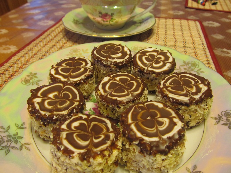 Jednotlivé macešky /kolečka/ namáčíme horní stranou do teplé čokoládové polevy a bílkovou polevou tvoříme po obvodu dva kroužky vzdálené od sebe 2 - 3 mm. Pomocí špejle nebo párátka táhneme polevu od obvodu ke středu vždy po ¼ /viz foto/, a tím se nám vytvaruje květ macešky.